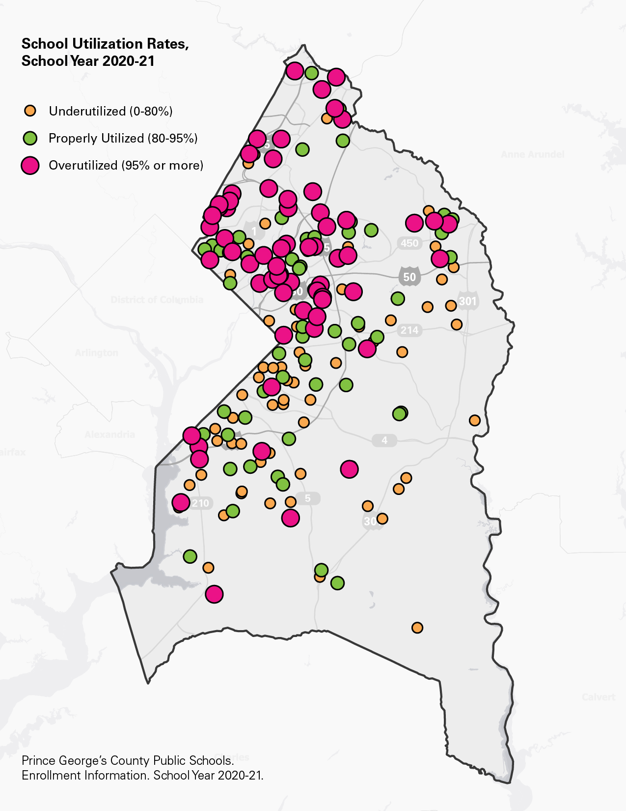 Prince George’s County is a diverse area, which includes both densely populated communities within the Beltway and rural areas. More over-utilized schools are located in the northern part of the district, while under-utilized schools are more likely to be located in the central and southern regions. This is due to demographic trends in recent years. As enrollment has grown, the geographic distribution of the student body has shifted toward the north.
