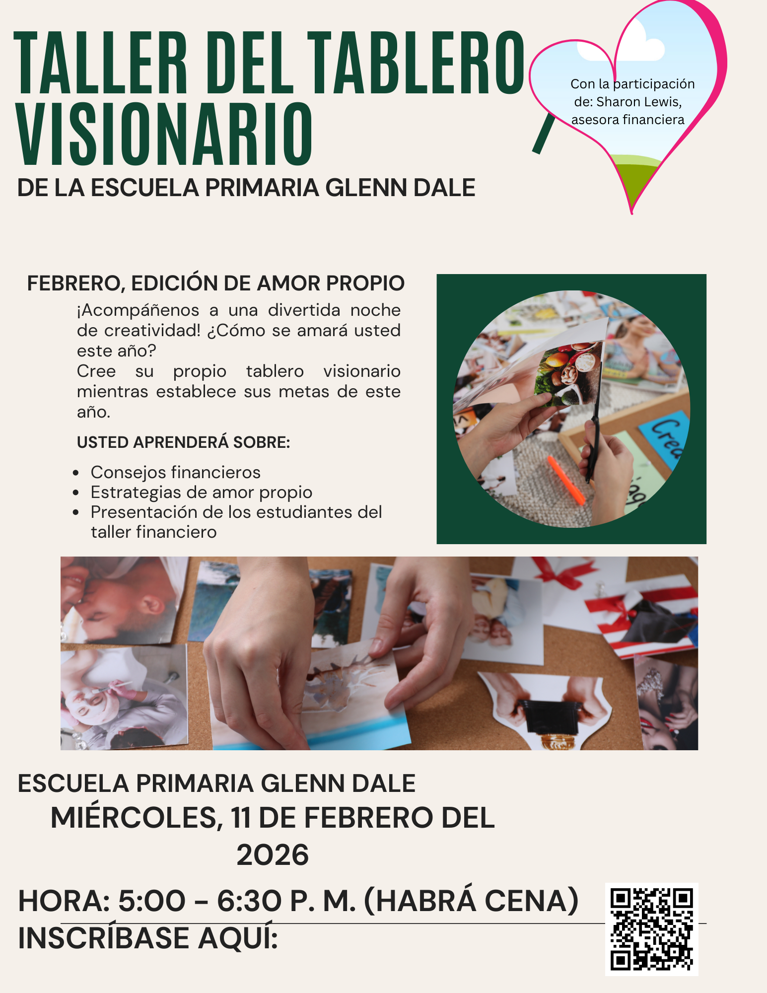 Join us for our Vision Board Workshop on February 11 from 5:00pm-6:30pm. How will you love yourself this year? Create your own vision board as you set goals for the year. Learn about financial tips and help kids with money. Dinner will be served! Register using the QR code on the flyer.